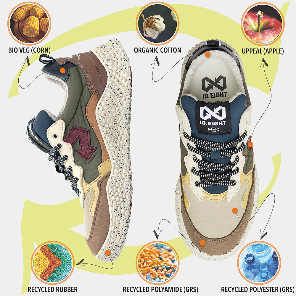 Ispirata ai colori delle foglie invernali, HANA FROSTED LEAVES abbina il verde della tomaia a dettagli marroni, arancio e una freccia bordeaux che cattura lo sguardo. Una sneaker decisa e ricca di sfumature, realizzata con poliestere riciclato idrorepellente, Uppeal (mela) e BioVeg (mais). Il sottopiede antibatterico e antiodore offre freschezza e comodità in ogni momento.
