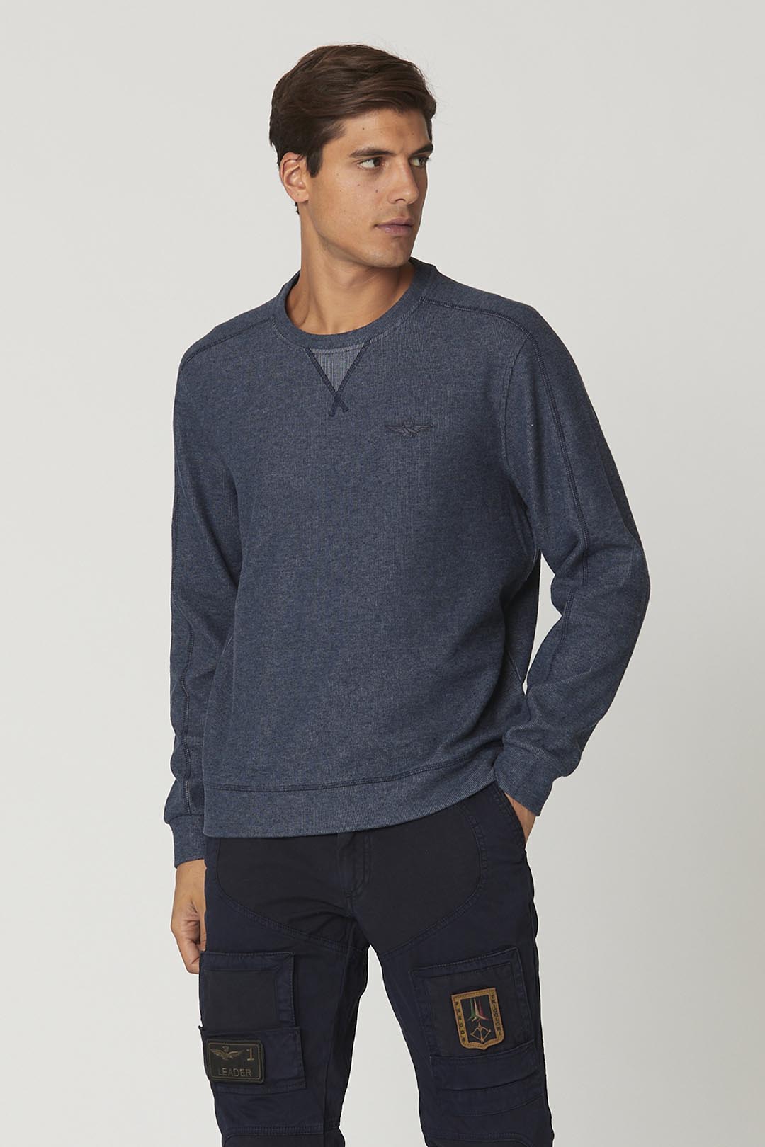 Una vestibilità rilassata per questa soffice felpa girocollo in misto cotone melangiato pensata per offriti il massimo comfort. Pratica da indossare, è impreziosita da una personalizzazione semplice ed elegante in similpelle raffigurate l'iconica aquila turrita, simbolo dei piloti militari.