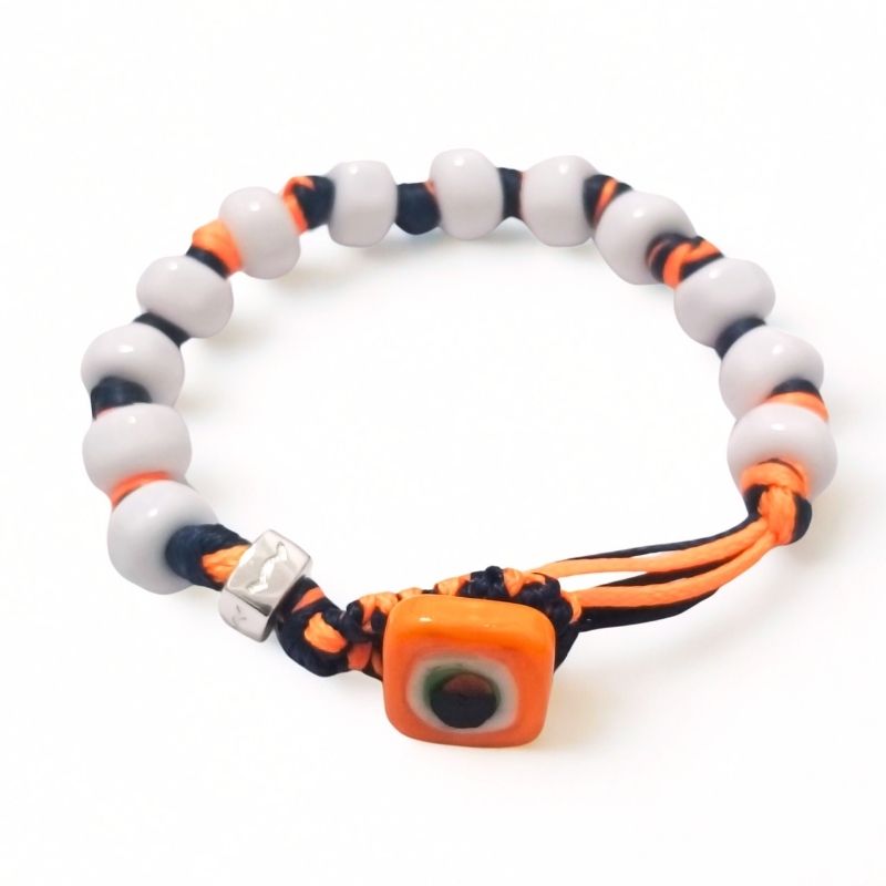 Braccialetto per uomo e donna con cordoncino in poliestere cerato, gocce in vetro lavorato a lume, disco di chiusura in vetro e dado in argento.