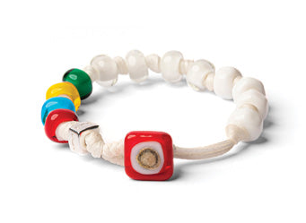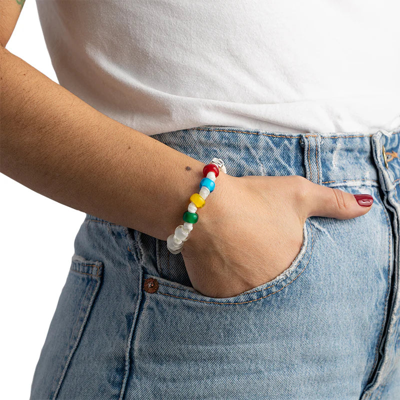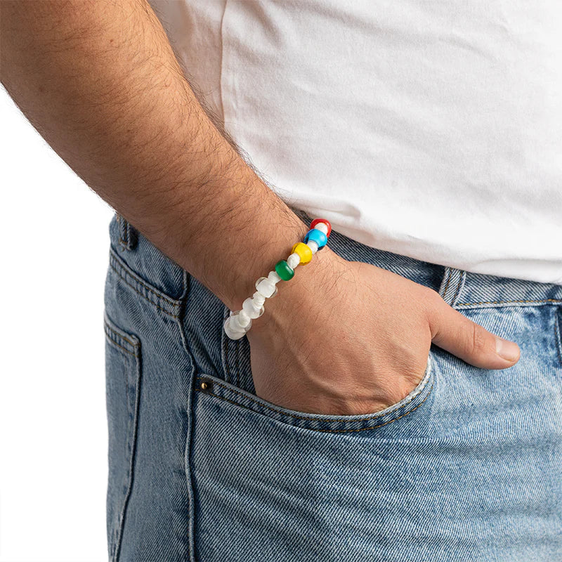 Braccialetto per uomo e per donna con cordoncino bianco in poliestere cerato e gocce di vetro di colore giallo, rosso, verde, azzurro.