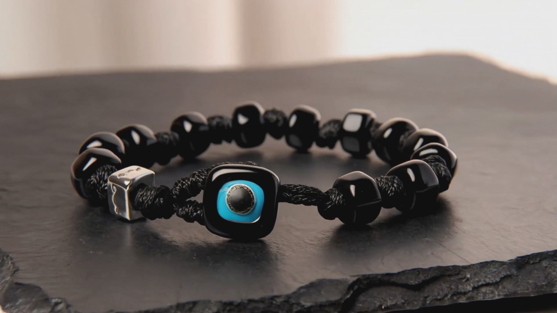 Braccialetto per uomo e donna con cordoncino nero in poliestere cerato e gocce di vetro di colore nero.