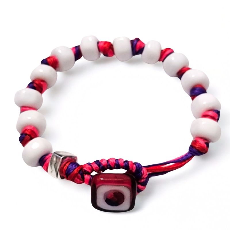 Braccialetto per uomo e donna con cordoncino in poliestere cerato, gocce in vetro lavorato a lume, disco di chiusura in vetro e dado in argento.