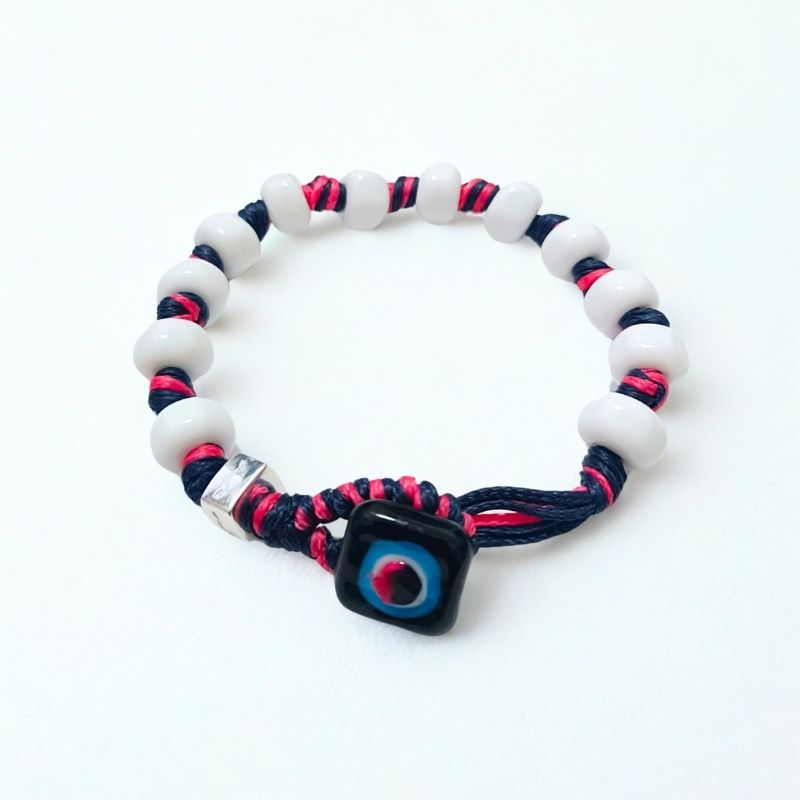 Braccialetto per uomo e donna con cordoncino in poliestere cerato, gocce in vetro lavorato a lume, disco di chiusura in vetro e dado in argento.