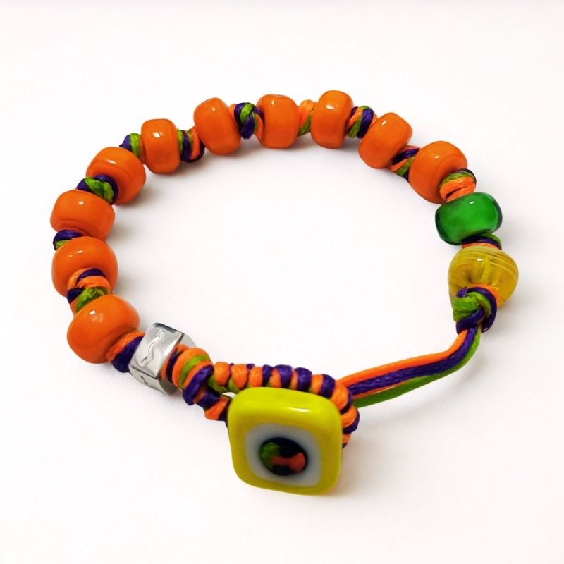 Braccialetto per uomo e donna con cordoncino in poliestere cerato, gocce in vetro lavorato a lume, disco di chiusura in vetro e dado in argento.