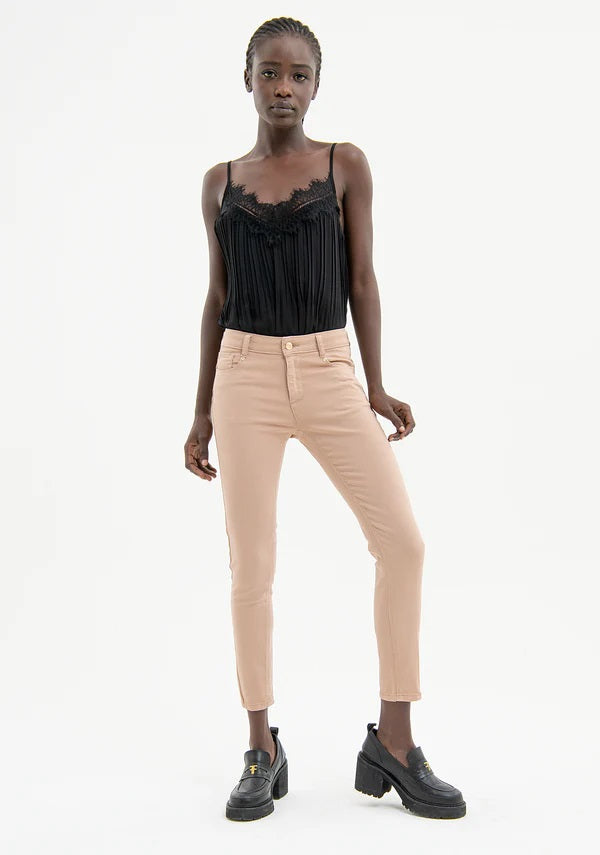 Jeans skinny effetto push up in gabardine, vita regolare, 5 tasche, e con fondo stretto.