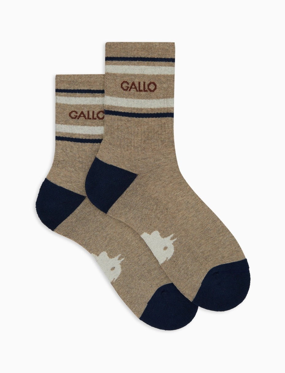 dio corte unisex in spugna di cotone, realizzate in Italia. Molto morbide al tatto e adatte ad un look casual. L'iconica scritta Gallo le rende originali e immediatamente riconoscibili. Realizzate in tinta unita beige con righe, punta, tallone e un gallo ricamato sotto al piede tutti di colore diverso.