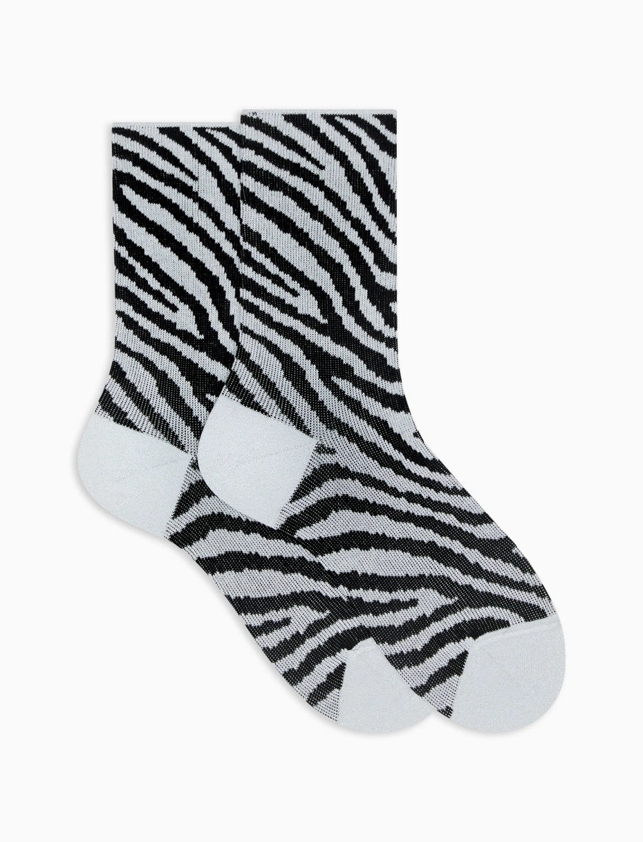 Calze corte da donna realizzate in Italia in morbido cotone elasticizzato nei toni del bianco. L'iconica fantasia zebrata le rende perfette per i look sportivi, mentre il lurex le rende adatte anche ai look casual o eleganti