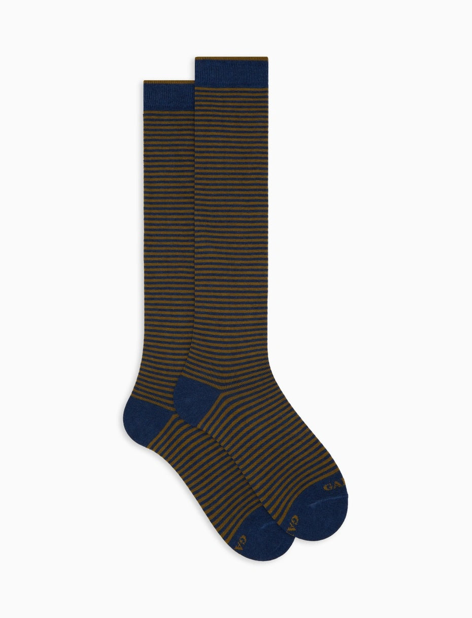 Calze lunghe da uomo realizzate in Italia in morbidissimo cotone. L'iconica fantasia a righe windsor, nei toni del blu, rende queste calze immediatamente riconoscibili e perfette da abbinare ad ogni tipo di look. Per un uomo attento ai dettagli che non rinuncia allo stile. Brand Gallo in punta a contrasto.