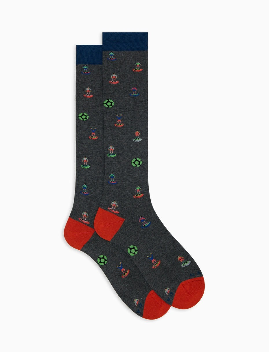 Calze lunghe da uomo in cotone leggerissimo nella tonalità del grigio, realizzate in Italia. Molto morbide al tatto, create per chi non rinuncia ad un dettaglio di stile. La fantasia calcio le rende cool e divertenti. Adatte ad un look formale o frizzante. La vestibilità perfetta Gallo, sinonimo di qualità italiana dal 1927