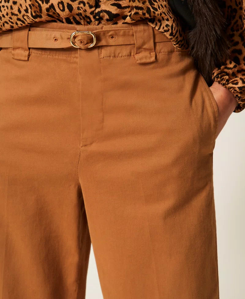 Pantaloni cropped modello chino in bull di cotone con cintura in coordinato e fibbia Oval T color oro. Ha chiusura con zip, tasche inserite ai fianchi, banda al fondo effetto risvolto, linea dritta.
